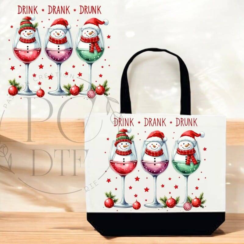 DTF pour tissus prêt à partir sur le thème de Noël avec thème de bonhomme de neige dans des verres de vin « Drink Drank Drunk ». Les UV DTF s’applique sur la plupart des tissus polyester, coton et plusieurs autres.