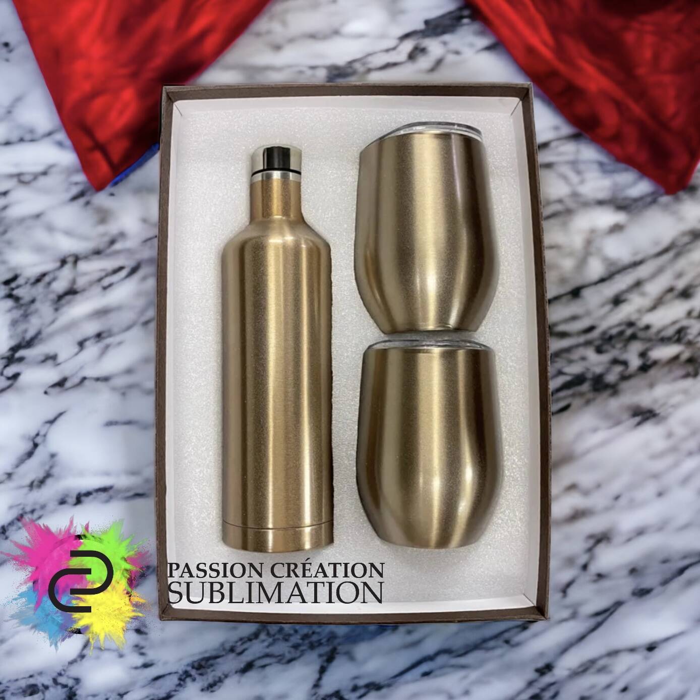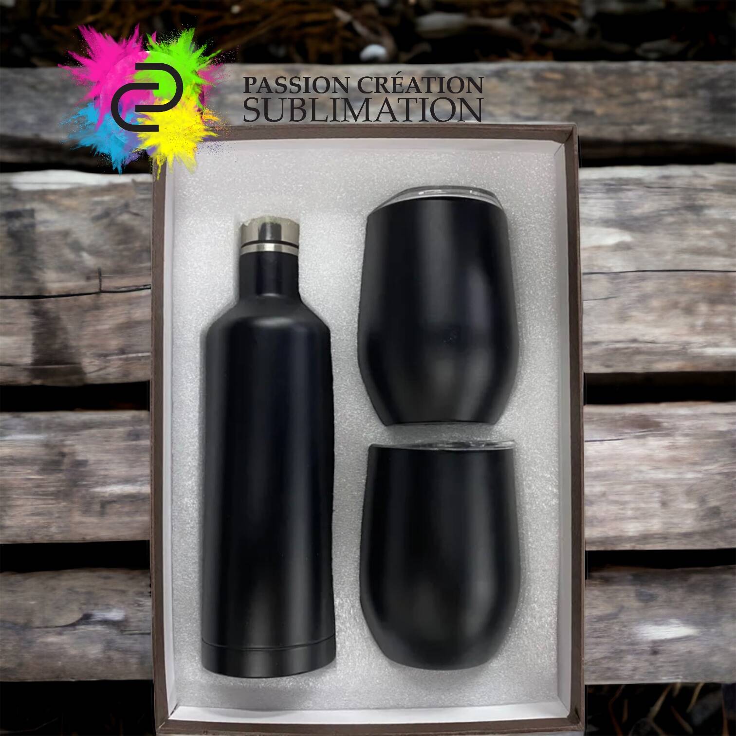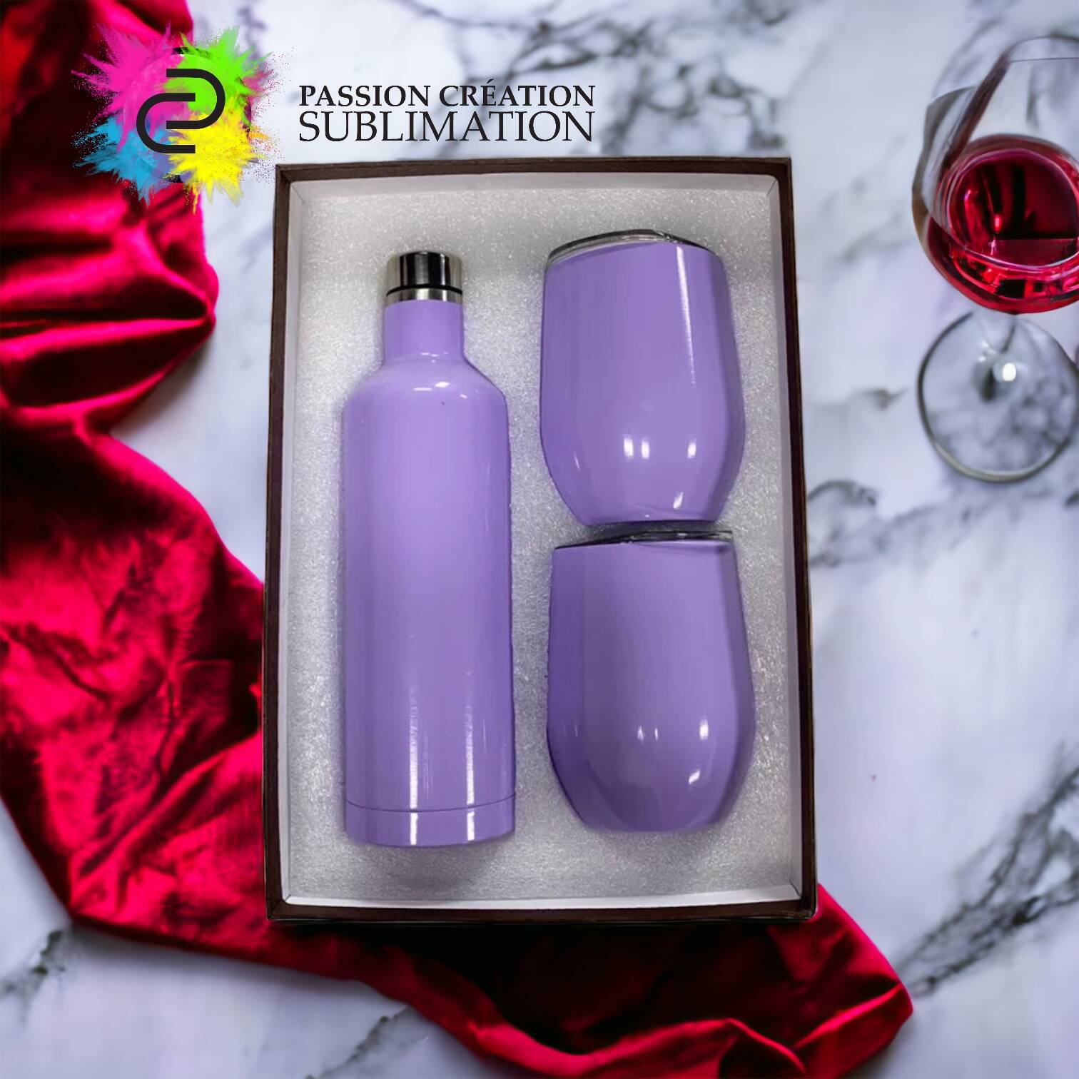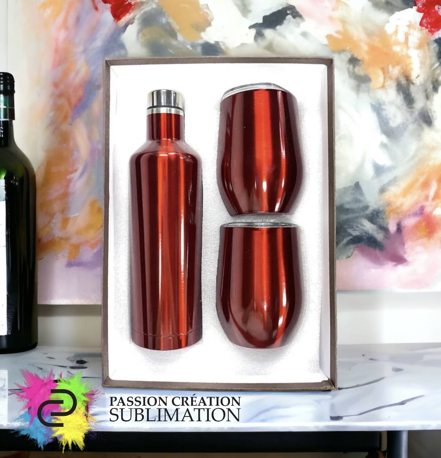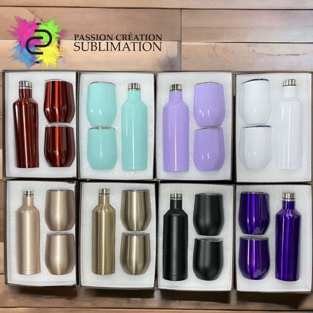 Ensemble de vin bouteille et verre à double paroi, en acier inoxydable colorés comprenant 1 bouteille 650 ml, avec 2 tumbler à vin 12oz et boîte cadeau. Pour DTF et vinyl seulement